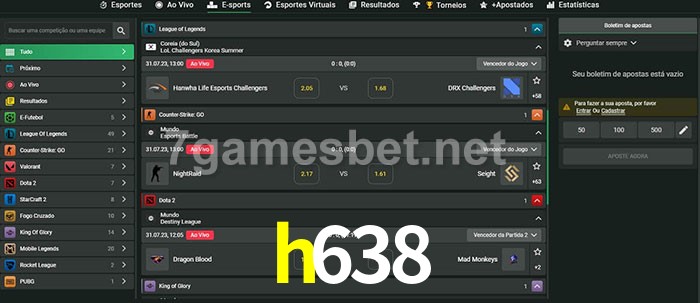 O h638 oferece uma grande seleção de opções de apostas em e-sports com probabilidades competitivas